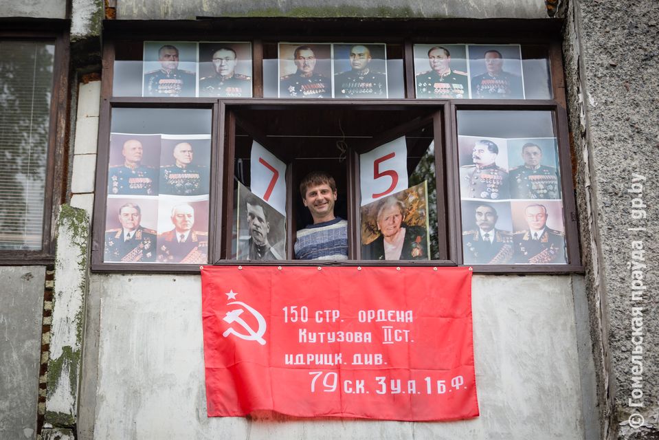 С балкона из этой инсталляции выглянул молодой мужчина, и мы поинтересовались, чей это душевный жест в праздник 75-летия Великой Победы. Выяснили, что лично его. Старший преподаватель кафедры методики физической культуры ГГУ имени Ф. Скорины Сергей Иванов пригласил зайти в квартиру, чтобы познакомить нас с судьбой своих дедов-героев. Педагог поделился: «Идея возникла спонтанно, дата ведь какая историческая. А мы наследники Победителей, людей, подаривших нам мирную жизнь. Флаг заказал онлайн, потом скачал из сети и распечатал рисованные портреты военачальников, фото дедушек — из семейного архива…»